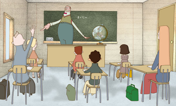 4. Også klasseromsscenen i tegnefilmversjonen av «Snill» har beholdt mange elementer fra bokillustrasjonen. Legg forresten merke til hvordan synsvinkelen skifter her; i boka er det leseren som betrakter Lussi og resten av tablået utenfra, mens den samme scenen i filmen er sett fra der Lussi sitter:
