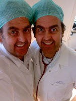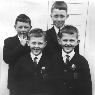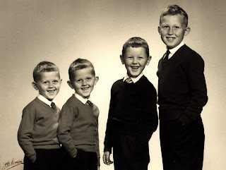Bonus-bilde (under): Kugutter i tøfler. Svein (til høyre) flørter med fotografen, mens Donald (nederst i midten) sklir ut og Egil er fjern. Til og med duken legger seg på skrå når tvillingene bærer våpen.
