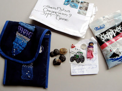 Fan mail and bribes: The first photo shows a Christmas gift to Lille Lu, the main character in Svein Nyhus' children's book "Lille Lu og trollmannen Bulibar" ("Little Lu and Bulibar the wizard"), sent from a five year old fan. The second photo shows "bribes" sent from a librarian to Svein Nyhus in order to speed up the sale of an original illustration.