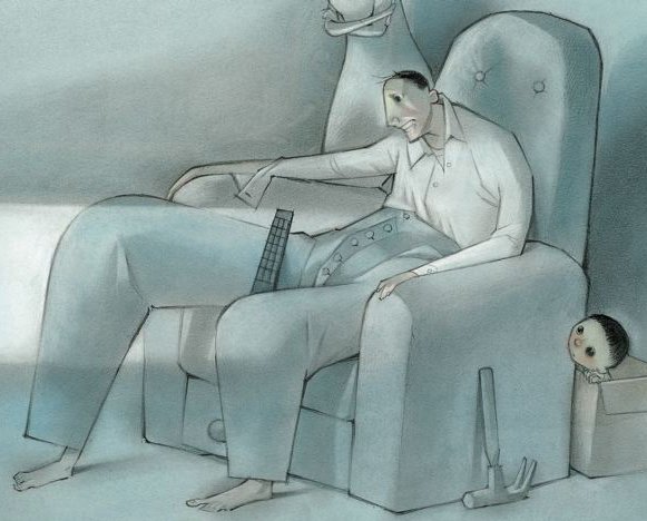 2. Det første bildet under (c) viser hvordan jeg tegna den aggressive faren i lenestolen i «Sinna Mann». Jeg brukte grov blyant på gråpapir for å skape et ekspressivt og dramatisk uttrykk. Neste bilde (d) viser en annen pappa i en annen lenestol. Det er henta fra bildeboka