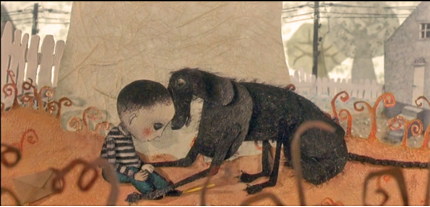 1. Bildene under viser Boj og den lyttende hunden, framstilt i boka (bilde a) og i filmen (b). Animatøren har beholdt det kollasjeprega og litt rufsete uttrykket fra bokillustrasjonen. Tegnefilmteknikken er såkalt