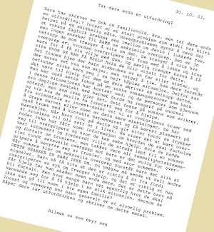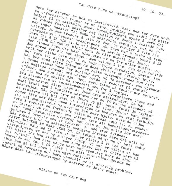 4. Etter at Gro og jeg lagde triologien «Bak Mumme bor Moni», «Snill» og «Sinna Mann», har vi mottatt flere oppfordringer om å ta opp andre alvorlige temaer i barnebøkene våre. Bildet under viser én av disse henvendelsene - et anonymt brev fra Oslo som utfordrer oss i å lage en bok om