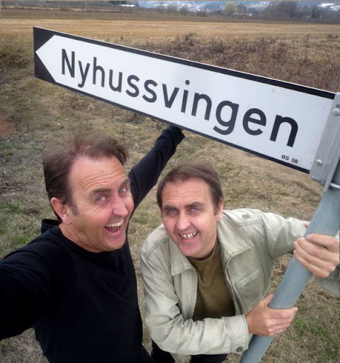 Summary in English: Today Norwegian illustrators Svein and Egil Nyhus, touring with their drawing show for school children, came across this road sign in Telemark. "Nyhussvingen" is "The Nyhus curve" in English. Great fun to read about oneself.