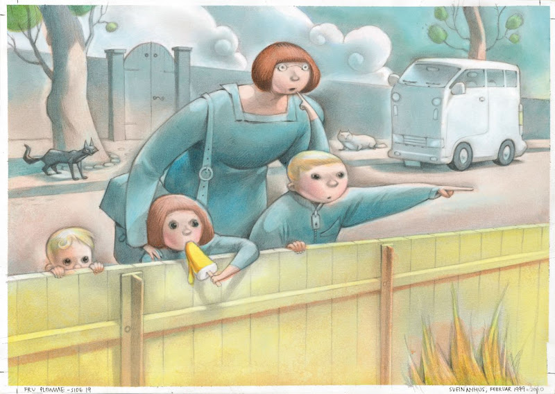 Summary in English: Picture Book Class #40: Pencil on tracing paper and digital colouring: Norwegian illustrator Svein Nyhus explains once again the drawing technique for one of his illustrations - this time from picture book "Mum's Hair" (original title "Håret til mamma", 2007): 1. Working with character design and technical experiments; 2: Sketching (thumbnails and layout rough); 3. Original art work; a. making a more detailed sketch and tracing this onto transparent tracing paper; b. penciling and smudging; c. cleaning and drawing light effects with a sharpened eraser and sweaping rubber fragments away; d: the finished pencil drawing with white paper behind the tracing paper; 4. digital colouring in photoshop; a. scanning pencil drawing and marbelized paper; b. creating masks, adding colours, adjusting details and background patterns; 5. final book illustration (27 x 39 cm, approx. 10 x 15"). Similar step-by-step-examples are here, here and here.