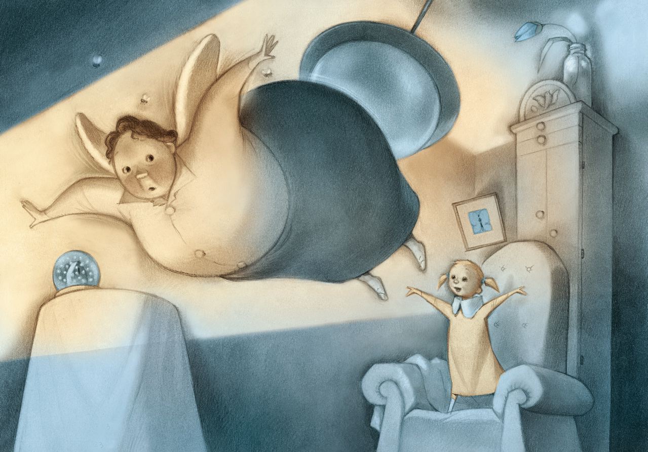 1. prøvetegning: Bildet viser hovedpersonene i boka, nemlig lille Lucia og tykke fru Plomme, i stue-scenen der fru Plomme flyr med vingene sine for første gang. Jeg har valgt en halvmorsom tegneseriestil med nesten overkontrollert formforenkling og veldig tydelige detaljer. Den lyse blyantteknikken er omtrent som i «Den grådige ungen» som kom to år tidligere.