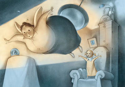Summary in English: Picture Book Class #40: Pencil on tracing paper and digital colouring: Norwegian illustrator Svein Nyhus explains once again the drawing technique for one of his illustrations - this time from picture book "Mum's Hair" (original title "Håret til mamma", 2007): 1. Working with character design and technical experiments; 2: Sketching (thumbnails and layout rough); 3. Original art work; a. making a more detailed sketch and tracing this onto transparent tracing paper; b. penciling and smudging; c. cleaning and drawing light effects with a sharpened eraser and sweaping rubber fragments away; d: the finished pencil drawing with white paper behind the tracing paper; 4. digital colouring in photoshop; a. scanning pencil drawing and marbelized paper; b. creating masks, adding colours, adjusting details and background patterns; 5. final book illustration (27 x 39 cm, approx. 10 x 15"). Similar step-by-step-examples are here, here and here.
