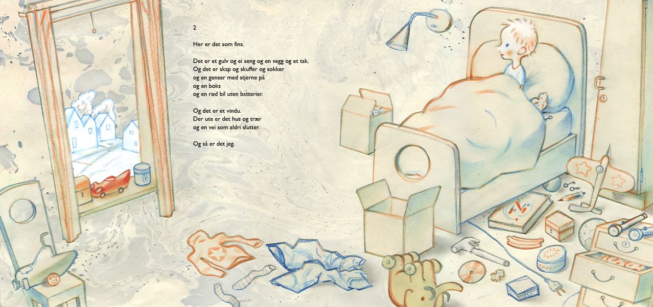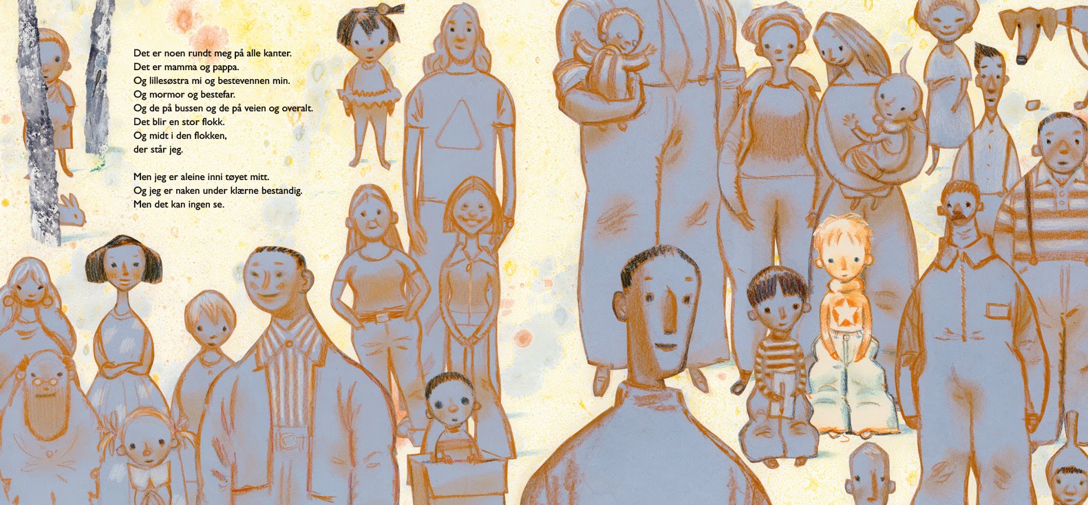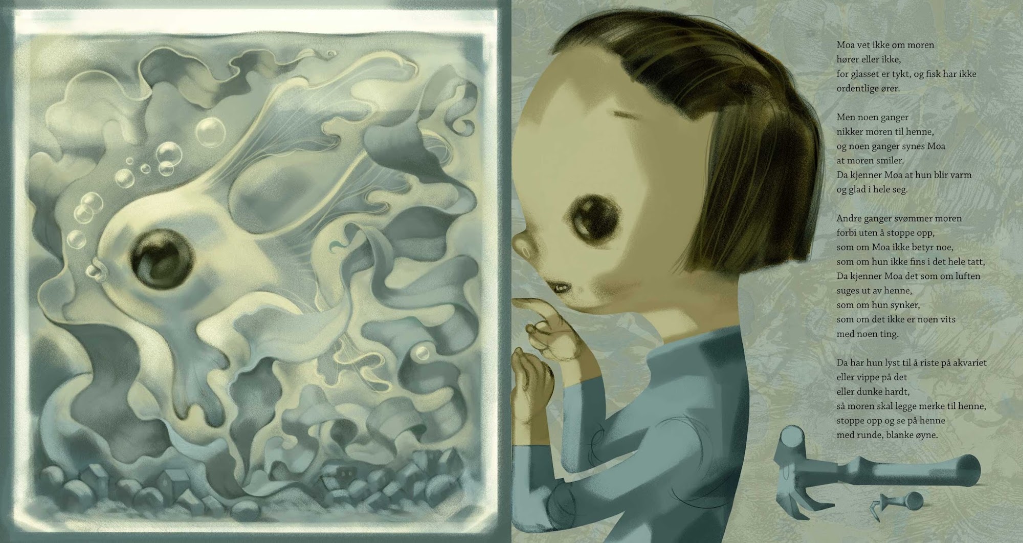 Summary in English: Danish translations of Gro Dahle's/Svein Nyhus's picture book "Akvarium" and Svein's "Ole er Ole" (Norwegian title "Lars er Lars") are out. Svein also discusses the risk of making the visual style too elaborate or dominant in a picture book. If an illustrator's technical skills are too masterful or the digital control are too rigorous, the illustrations may become impressive, but they may also take away the attention from the story. The result may be overworked art work without lively spontaneity and emotional touch.